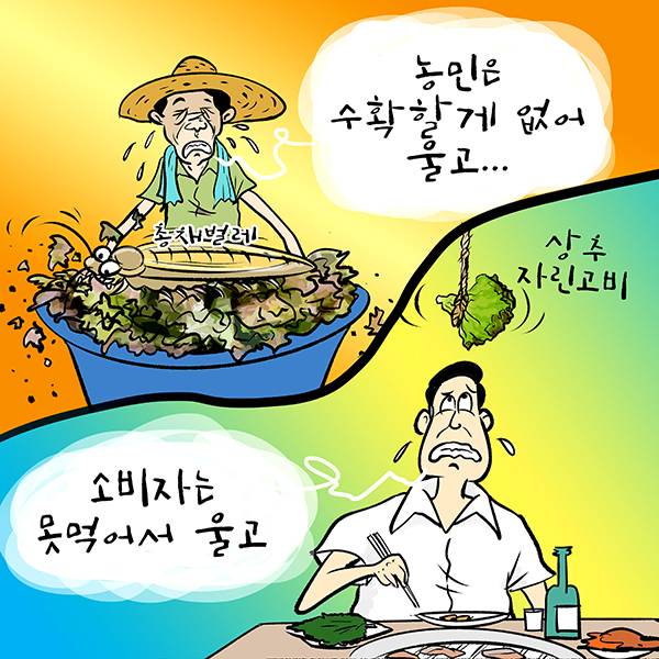 [김진호의 농민만평] 2022년 8월10일 2022. 8. 10. 05:42 음성으로 듣기 음성재생 설정 이동 통신망에서 음성 재생 시 데이터 요금이 발생할 수 있습니다. 글자 수 10,000자 초과 시 일부만 음성으로 제공합니다. 남성 여성 느림 보통 빠름 음성 재생하기 닫기 음성 재생 중지 번역 설정 번역beta Translated by kaka i 한국어 - English 영어 日本語 일본어 简体中文 중국어 Nederlands 네델란드어 Deutsch 독일어 Русский 러시아어 Malaysia 말레이시아어 বাঙ্গোল ভাষা 벵골어 tiếng Việt 베트남어 Español 스페인어 اللغة العربية 아랍어 Italiano 이탈리아어 bahasa Indonesia 인도네시아어 ภาษาไทย 태국어 Türkçe 튀르키에어 Português 포르투갈어 Français 프랑스어 हिन्दी 힌디어 닫기 번역중 Now in translation 글씨크기 조절하기 글자크기 설정 파란원을 좌우로 움직이시면 글자크기가 변경 됩니다. 가 매우 작은 폰트 작은 폰트 보통 폰트 큰 폰트 매우 큰 폰트 가 이 글자크기로 변경됩니다. (예시) 가장 빠른 뉴스가 있고 다양한 정보, 쌍방향 소통이 숨쉬는 다음뉴스를 만나보세요. 다음뉴스는 국내외 주요이슈와 실시간 속보, 문화생활 및 다양한 분야의 뉴스를 입체적으로 전달하고 있습니다. 닫기 인쇄하기 QR코드를 찍으면 디지털 만평을 볼 수 있습니다 농민은 수확할게 없어 울고, 소비자는 못먹어서 울고... 김진호 시사만화가 Copyright © 농민신문. 무단전재 및 재배포 금지.