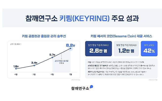 블록체인 기반 통합 키(KEY) 플랫폼 기업 참깨연구소(대표 김도현)는 디지털 키 플랫폼 ‘키링(KEYRING)’의 ‘공동현관 출입문 관리 솔루션’이 출시 5개월 만에 사용자 8만 세대를 돌파했다고 10일 밝혔다.