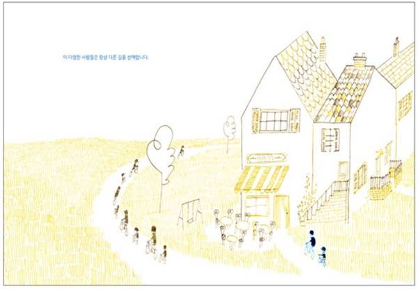 | ▲ 그림책 <쫌 이상한 사람들>의 한 장면. 아빠와 아들로 보이는 두 사람이 자전거를 타고 '향긋한 찻집'으로 향하고 있다. |