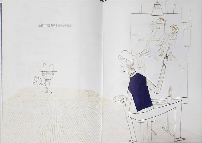 | ▲ 그림책 <쫌 이상한 사람들>의 한 장면. 카우보이 흉내를 내고 있는 아이를 멋진 카우보이로 그리는 사람이 있다. |