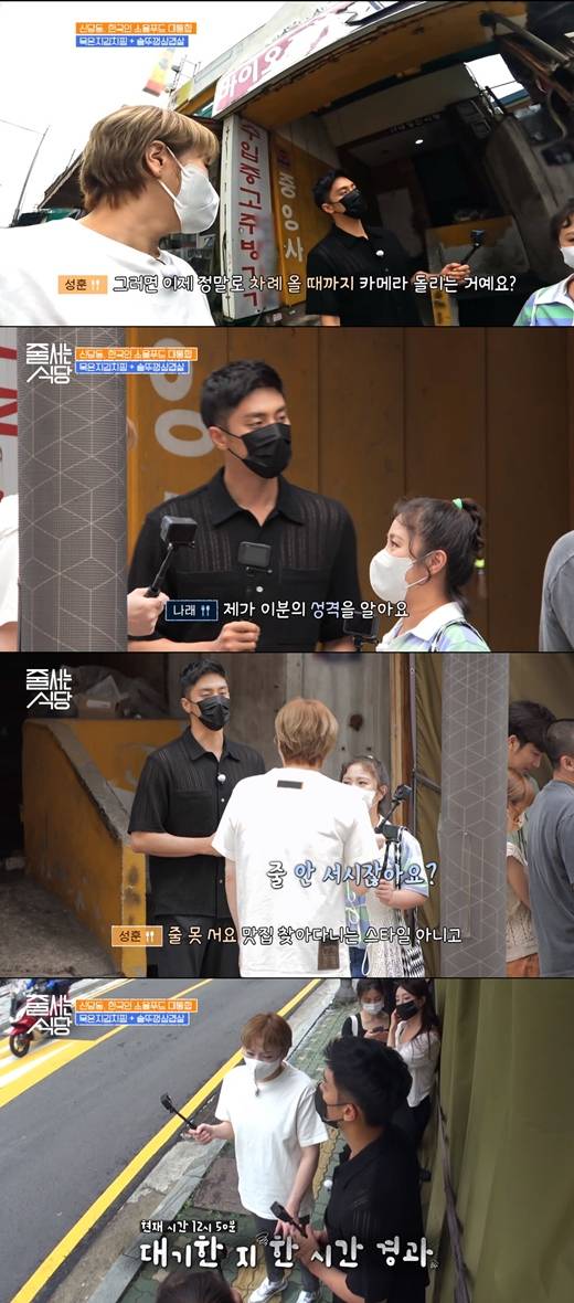 성훈은 그런 자신의 성격을 '줄 서는 식당'에서도 숨기지 않았다. 줄을 선 지 1시간이 지나고 박나래가 "미안해, 오빠"라고 말하자 성훈은 "다른 데 가자"라고 다시 한번 말했다. 작은 개인용 카메라를 바닥에 내려놓으며 지쳤음을 어필하기도 했다.