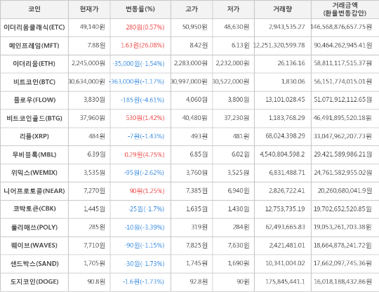 또한, 무비블록(4.75%, 6.39원), 비트코인골드(1.42%, 37,960원), 니어프로토콜(1.25%, 7,270원), 이더리움클래식(0.57%, 49,140원)이 상승세를 나타냈다.