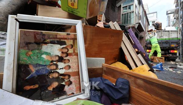 10일 오전 집중호우로 큰 피해를 본 관악구 신사전통시장 인근 주택가에 침수된 가구 중 한 가족의 가족사진이 놓여 있다.