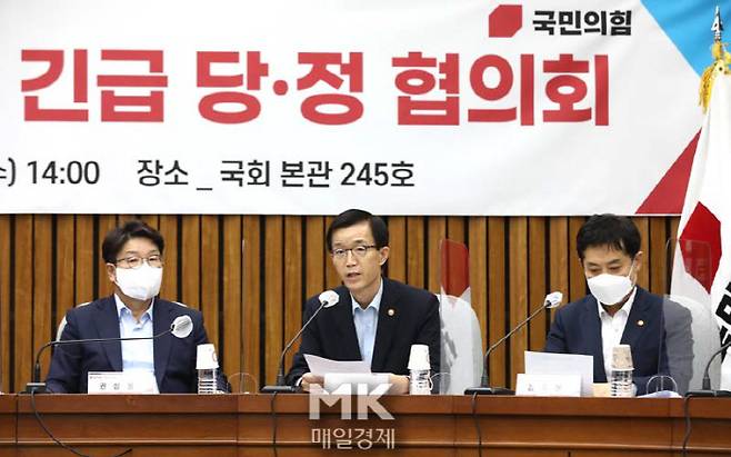 방문규 국무조정실장(가운데)이 10일 오후 국회에서 열린 수해대책점검 긴급 당·정 협의회에서 모두발언을 하고 있다. 2022.8.10