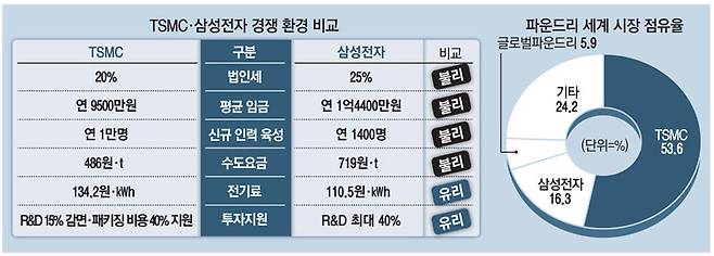 지난해 기준으로 TSMC의 임직원 1인당 평균 임금은 약 9500만원이었다. 1억4400만원 수준인 삼성전자보다 인건비 부담이 작았다. 매년 반도체 인력 양성 규모는 대만이 1만명 규모로 현재 1400명 수준에 불과한 한국에 비해 압도적으로 컸다.