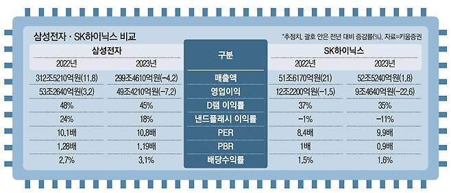 반면 SK하이닉스의 경우 올해 추정 영업이익이 12조2200억원으로 전년보다 1.5% 감소할 것으로 전망된다. 2023년 영업이익 감소율은 22.6%로 더욱 높아지게 된다. 메모리 반도체 가격 하락세와 더불어 출하량이 부진했던 점도 수익성에 큰 악영향을 미쳤다.