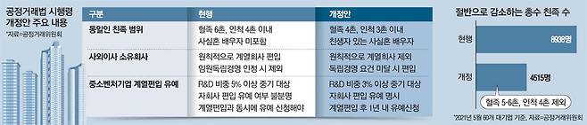 다만 공정위는 실질적으로 총수 지배력 강화에 기여하는 경우에는 규제를 유지하기로 했다. 총수 측 회사의 주식 1% 이상을 보유하거나 총수 본인, 총수 측 회사와 채무보증·자금대차 관계가 있는 경우엔 친족 관계를 인정하고 특수관계인에 포함시킨다.