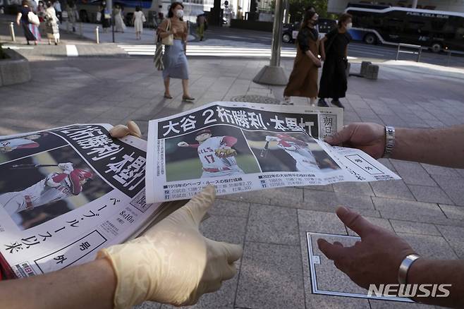 [도쿄=AP/뉴시스] 10일 일본 도쿄에서 미프로야구 LA 에인절스의 오타니 쇼헤이에 관한 아사히 신문 호외판이 배포되고 있다. 오타니는 9일(현지시간) 미 캘리포니아주 오클랜드의 오클랜드 콜리세움에서 열린 2022 메이저리그 오클랜드 애슬레틱스와의 경기에서 투수로 10승을 올리고 25호 홈런포를 가동하며 메이저리그 역사상 처음으로 한 시즌 10승-20홈런 이상의 대기록을 달성했다. 기존 '투수 10승-타자 10홈런' 기록은 베이브 루스가 1918년 기록한 13승-11홈런이었다. 2022.08.10.