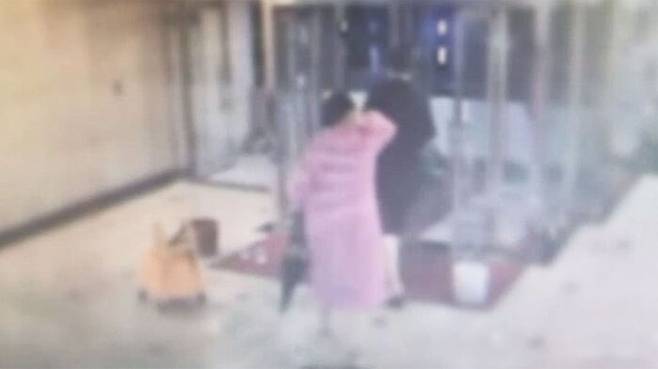 우산을 든 남성과 붉은색 우비를 입은 여성이 1층 로비를 나섭니다.