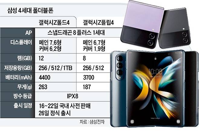 ‘폴더블폰 대중화’를 선언한 삼성전자의 4세대 폴더블폰(갤럭시Z폴드4·갤럭시Z플립4)이 베일을 벗었다. 무겁다는 불만이 많았던 갤럭시Z폴드는 가벼워졌고, 빨리 방전됐던 갤럭시Z플립엔 고용량 배터리가 들어갔다. 전작의 단점을 보완한 4세대 폴더블폰이 글로벌 경기 악화로 침체에 빠진 스마트폰 시장의 판도를 바꿀 수 있을지에 관심이 쏠리고 있다.