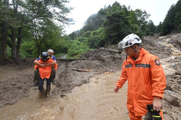 산사태로 토사가 대거 유입된 강원도 횡성군 청일면 매피지골에서 소방대원이 고립된 주민을 업고 마을을 빠져나오고 있다. 이날 강원·충청권에는 최대 200㎜ 안팎의 폭우가 쏟아졌다. 정체전선은 다시 북상해 12일까지 서울 등 수도권에 최대 120㎜ 이상 비를 퍼부을 것으로 예상된다. 연합뉴스