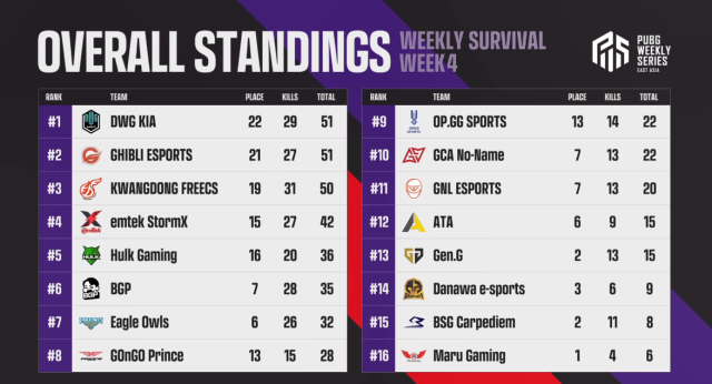 DK는 10일 서울 송파구 롯데월드 내 비타오백 콜로세움에서 열린 '2022 펍지 위클리 시리즈(PWS): 페이즈2' 4주차 위클리 서바이벌 첫째 날 경기(매치1~5)에서 51점(킬 포인트 29점)을 누적하며 1위에 올랐다.
