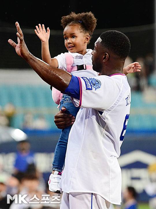 연장 10회말 1사 2, 3루에서 끝내기 안타를 친 삼성 피렐라가 딸 아이타나와 함께 환호하는 팬들에게 손을 흔들면서 답하고 있다.