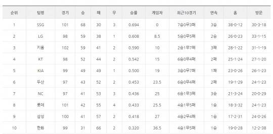 [10일 프로야구 팀 순위]'3위 키움~6위 두산은 패하고 7위 NC~9위 삼성은 모두 승리해 순위는 변동없어, LG-한화는 우천 취소