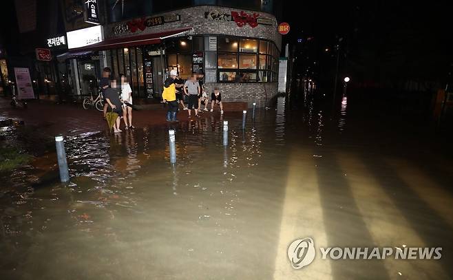 (청주=연합뉴스) 천경환 기자 = 10일 충북 청주시 흥덕구 복대동의 한 아파트 앞 도로가 물에 잠겨 있다. 2022.8.10