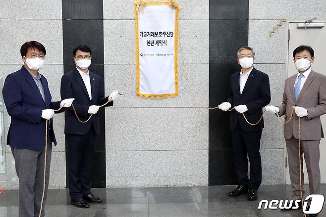 왼쪽부터 노진상 중소벤처기업부 기술보호과장, 조주현 차관, 김종호 기술보증기금 이사장, 이종배 기술보증기금 전무이사.(중소벤처기업부 제공) 2022.8.10/뉴스1
