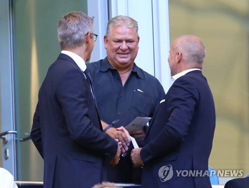 epa10114118 Former Hamburg SV head coach Frank Pagelsdorf (C) at the memorial ceremony for former Hamburg SV soccer player Uwe Seeler at the Volkspark stadium in Hamburg, northern Germany, 10 August 2022. Former HSV soccer player Uwe Seeler died on 21 July 2022, at the age of 85. EPA/Ibrahim Ot / POOL Pool