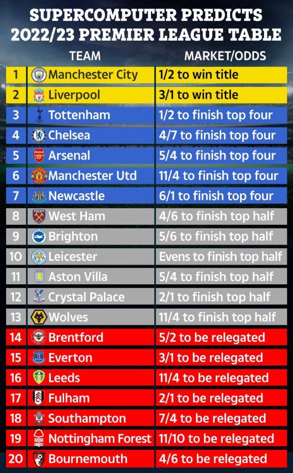 영국 언론 '더 선'은 10일(한국 시간) 슈퍼컴퓨터의 2022-23시즌 잉글랜드 프리미어리그 순위 예측을 전했다.