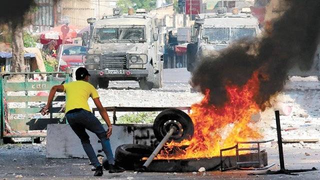 9일 팔레스타인 요르단강 서안지구의 북부 도시 나블루스에서 노란 옷을 입은 한 남성이 이스라엘군 전투차를 향해 돌을 던지려 하고 있다.