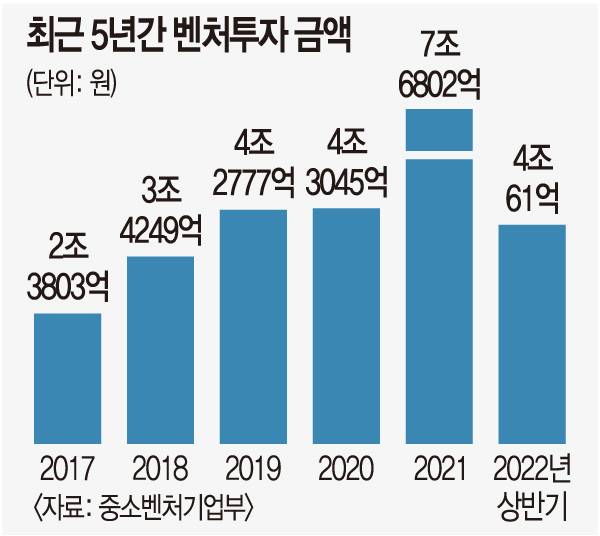 10일 중소벤처기업부에 따르면 지난해 벤처 투자액은 전년보다 78.4% 증가한 7조6802억원으로 역대 최대를 기록했다. 2017년 약 2조4000억원에서 4년 만에 3배 이상 늘었다. 올해 상반기 벤처 투자액은 4조61억원으로 종전 역대 최대치인 지난해 상반기보다 24.3% 상승했다.