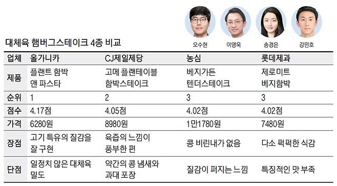 1등은 올가니카 계열사 브라잇벨리의 '플랜트 함박 앤 파스타'가 차지했다. 오수현 기자는 "비교 제품 중 고기 질감이 가장 쫀득하다. 고기 특유의 텍스처를 제일 잘 구현했다"며 "전자레인지에 돌려먹는 간편식임에도 꽤 만족스러운 풍미와 맛을 선사한다"고 평가했다. 다만 "고기 밀도가 일정하지 않은 것 같다"며 아쉽다고 했다. 이영욱 기자는 "고기는 담백한 편으로 간이나 풍미가 강하진 않아서 부담이 없지만 그러다 보니 풍미는 다소 떨어지는 듯하다"고 했다. 송경은 기자는 "100g당 기준으로 비교했을 때 단백질 함량은 비슷하지만 비교 제품들 중 지방 성분이 가장 적다"면서 "타 제품 대비 수분감(육즙)이 많이 느껴지지는 않는 편"이라고 했다. 강민호 기자는 "필요한 만큼만 포장을 했다. 대체육 소비자라면 환경에도 관심이 많을 듯한데 과대 포장하지 않은 느낌이라서 호감을 줄 듯하다"며 "조리편의성이 높다"고 평했다. 하지만 "고구마, 아스파라거스 등이 가니시로 있는데 맛이 그다지 좋지 않다"고 했다.
