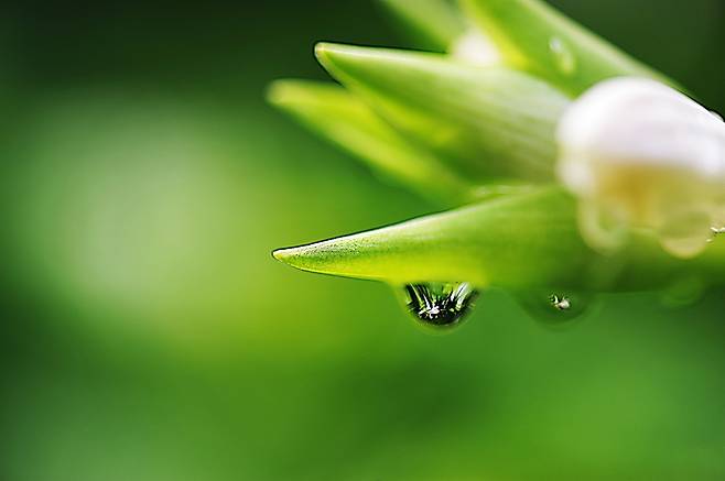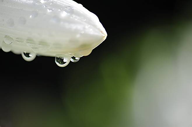 | ▲ 옥잠화 꽃잎에 맺힌 비이슬 |