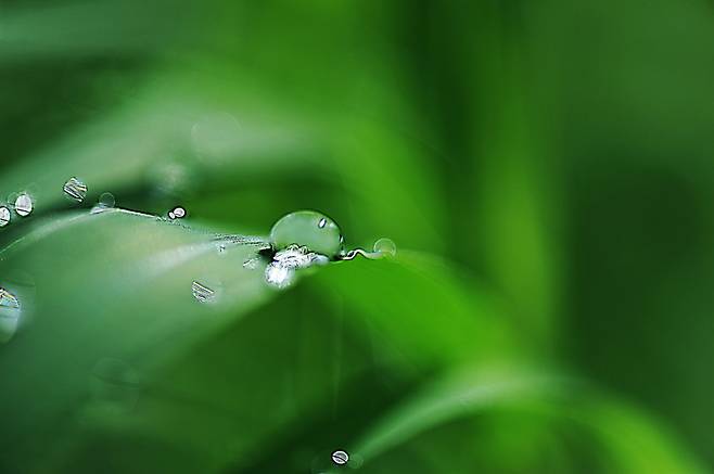 | ▲ 풀잎에 맺힌 비이슬 |