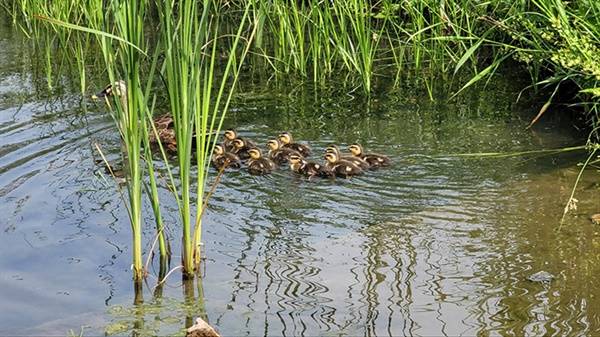 | ▲ 지난 6월 초 화정천에 서식하는 물오리가 산란에 성공해 아기 오리들을 몰고 이동하고 있습니다. |