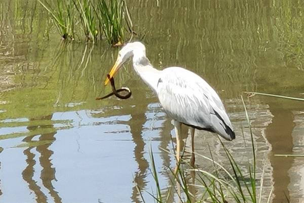 | ▲ 지난 6월경 왜가리로 보이는 새가 민물장어로 보이는 물고기를 잡아서 삼키기 직전의 모습입니다. |