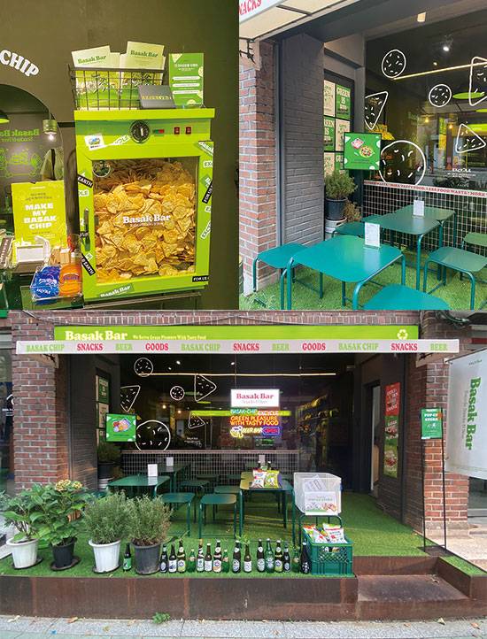 국내 트렌드의 시작점이자 핫플레이스의 집결지, 성수동에 작은 바(Bar)가 생겼다. 프로젝트 렌트와 CJ제일제당 EXCYCLE이 함께 선보인 ‘바삭 바’는 지구를 생각한 스낵과 맥주가 있는 캐주얼 바이자 팝업스토어로, 푸드업사이클링 경험을 쉽고 재미있게 전한다. 이곳의 메인 콘셉트 겸 핵심 상품인 익사이클 바삭칩은 CJ제일제당 식품 사내벤처 프로그램을 통해 발굴한 제품이다. 햇반에서 나온 깨진 조각쌀과, 행복한 콩 두부에서 나온 비지를 약 60% 함유한 푸드업사이클링 스낵으로, 뻥튀기와 같은 퍼핑공정을 통해 담백함과 고소함을 살렸다. 바삭 바에서는 바삭칩 2종(오리지널, 핫스파이시)을 활용한 칠리 콘카르네와 치즈 플래터, 비건 인증을 받은 수제맥주 전문 브랜드 인천맥주와 협업해 다양한 크래프트 맥주를 선보인 바 있다. 성수동 골목이 한순간에 해외의 작은 바로 변하기 충분한 맛과 분위기다. 그 밖에도 익사이클 바삭칩 캐릭터를 활용하거나 친환경 콘셉트를 살린 굿즈, 에코백, 티셔츠, 접시, 스티커와 바삭칩, 맥주, 유리잔 등으로 구성된 피크닉용 선물세트를 판매했다. 팝업스토어는 7월 말까지 운영됐으며, 바삭칩 2종은 현재 올리브영 등에서 만나볼 수 있다.
