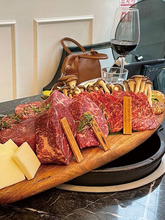 숙성 한우와 퓨전요리 코스를 즐길 수 있는 고급 철판구이 레스토랑이다. 보통의 한우 전문점과 다른 점은 바로 ‘워터에이징’ 숙성 방식을 적용한다는 것. 한우를 21일간 물속에서 저온 숙성하는 방법으로 깊은 풍미가 매력적이다. 이곳의 대표 메뉴는 B코스(런치120g 6만9000원/디너 120g 12만9000원)로 꽃등심, 안심, 새우살, 살치살로 구성되며, 한우와 잘 어울리는 임실치즈, 소스 등이 함께 제공된다. 점심과 저녁 모두 코스로만 서빙되며 아뮤즈부쉬와 한우 카르파쵸, 새우 고로케, 코코넛 관자, 시칠리안 파스타, 소르베, 미역국, 디저트 등이 포함돼 있다. 와인 콜키지는 무료이며 프라이빗 룸에는 인공지능 스피커가 비치되어 회식, 모임, 데이트 등의 자리에서 원하는 음악도 들을 수 있다.