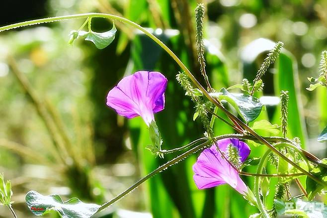 꽃과 나비 그리고 거미줄이 있는 여름 일상 풍경입니다.