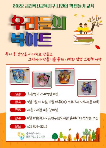 이 프로그램은 2022 금천혁신교육지구 '나만의 책 만들기(북아트) 교육'의 하나로 초등학교 2∼4학년을 대상으로 진행한다.