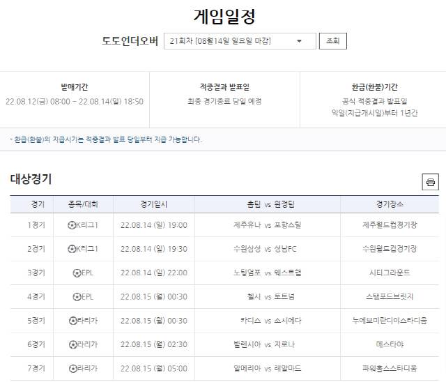 이번 '토토언더오버' 21회차는 14일 오후 6시50분에 발매가 마감되며, 경기가 모두 종료된 후에 스포츠토토 홈페이지 및 공식온라인 발매사이트 베트맨을 통해 결과가 발표된다.