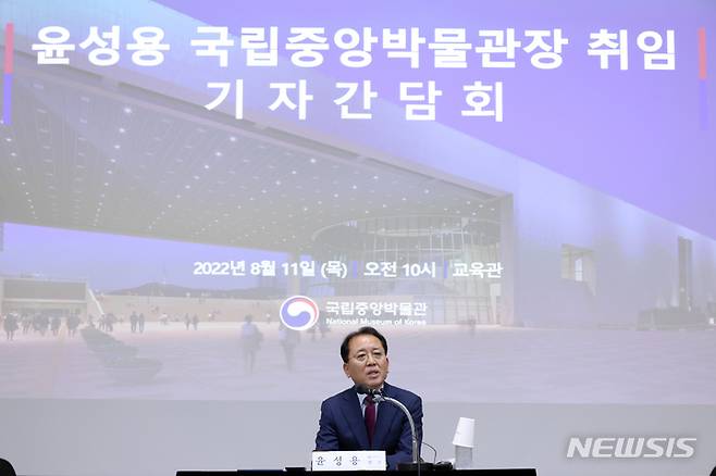 [서울=뉴시스] 박진희 기자 = 윤성용 국립중앙박물관 관장이 11일 서울 용산구 국립중앙박물관 교육관에서 취임 기자간담회를 갖고 하반기 주요업무 계획을 발표하고 있다. 2022.08.11. pak7130@newsis.com