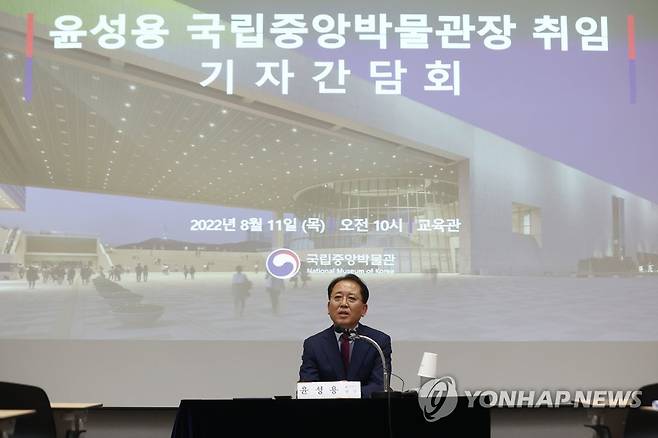 (서울=연합뉴스) 진연수 기자 = 윤성용 신임 국립중앙박물관장이 11일 오전 서울 용산구 국립중앙박물관 교육관에서 열린 취임 기자간담회에서 인사말을 하고 있다. 2022.8.11