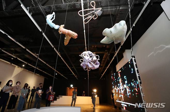 [서울=뉴시스] 추상철 기자 = 2022 아르코미술관 융복합 예술 페스티벌 '땅속 그물 이야기' 전시회 기자간담회가 열린 11일 오전 서울 종로구 아르코미술관에서 참석자들이 전시 작품 설명을 듣고 있다. 2022.08.11. scchoo@newsis.com