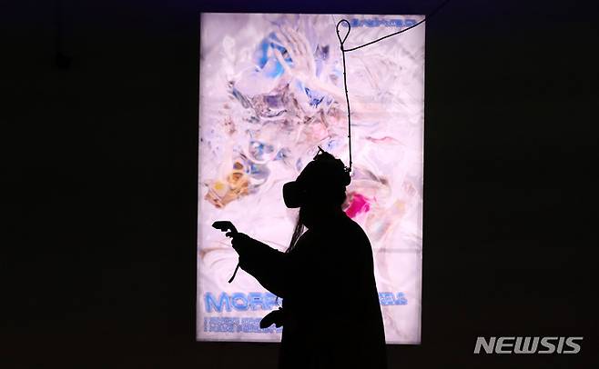 [서울=뉴시스] 추상철 기자 = 2022 아르코미술관 융복합 예술 페스티벌 '땅속 그물 이야기' 전시회 기자간담회가 열린 11일 오전 서울 종로구 아르코미술관에서 참여 작가가 VR을 통한 시뮬레이션 시연을 하고 있다. 2022.08.11. scchoo@newsis.com