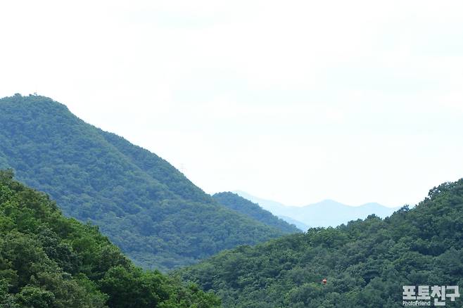 임도가의 무성한 풀과 먼 산은 푸르름이 가득합니다.