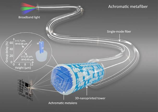 연구팀은 색수차 보정이 가능한 메타렌즈를 이용해 문제를 해결했다. 두께가 머리카락의 1000분의 1 수준인 나노구조체를 주기적으로 배열한 메타포면으로 빛을 자유자재로 조절할 수 있는데, 이를 통해 빛을 한 곳에 모으는 초박막 메타렌즈를 만들 수 있다. 연구팀은 메타렌즈를 광섬유와 결합해 선명한 이미지를 볼 수 있으면서도 부피를 대폭 줄이는 데 성공했다.