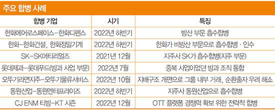 재계의 합병 움직임은 지난해 말부터 본격화했다. SK㈜가 자회사인 SK머티리얼즈를 합병한 것을 시작으로 올 들어 롯데제과·푸드의 빙과 사업 부문 합병, 포스코인터내셔널과 포스코에너지 합병, 오뚜기의 오뚜기라면지주·오뚜기물류서비스 합병, KT의 미디어 자회사인 스카이라이프TV와 미디어지니 간 합병 검토 등이 줄을 이었다.
