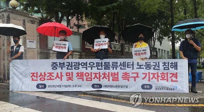 (대전=연합뉴스) 이주형 기자 = 민주노총 공공운수노조 전국민주우체국본부가 11일 오후 대전고용노동청 앞에서 중부권광역우편물류센터의 비정규직 노동자 노동권 침해 규탄 기자회견을 열고 있다. 2022.8.11