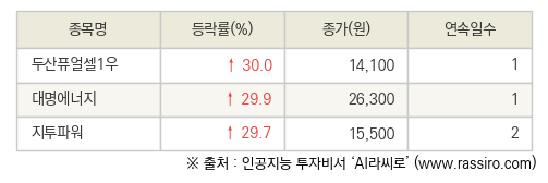 [fnRASSI]오늘의 상한가, 두산퓨얼셀1우 30.0% ↑