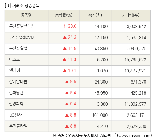 [fnRASSI]장마감, 거래소 상승 종목(두산퓨얼셀1우 30.0% ↑)