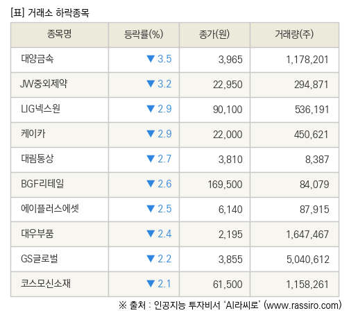 [fnRASSI]장마감, 거래소 하락 종목(대양금속 -3.5% ↓)