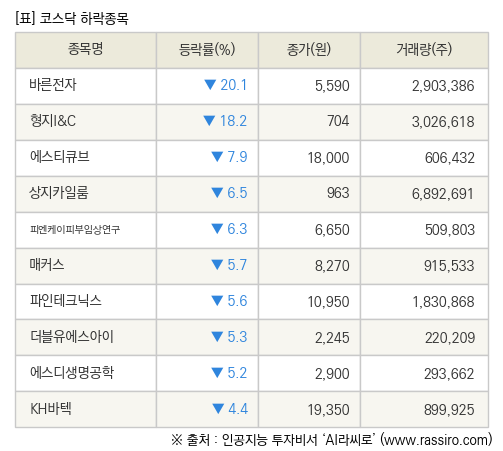 [fnRASSI]장마감, 코스닥 하락 종목(바른전자 -20.1% ↓)