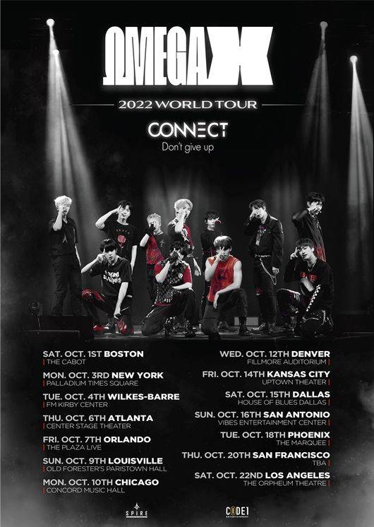 오메가엑스(재한, 휘찬, 세빈, 한겸, 태동, XEN, 제현, KEVIN, 정훈, 혁, 예찬)는 11일 정오 공식 2022 월드투어 ‘CONNECT : Don't give up’ 포스터를 오픈, 투어 추가 지역으로 켄자스시티와 샌프란시스코를 확정했다.