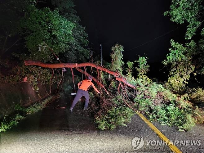 (서울=연합뉴스) 지난 10일 집중호우로 인해 충남 홍성군 홍동면 도로로 나무가 쓰러져 출동한 소방대원이 안전조치를 하고 있다. 2022.8.11 [소방청 제공. 재판매 및 DB 금지]