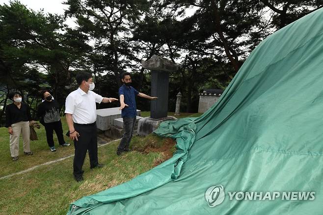 (서울=연합뉴스) 최응천 문화재청장이 11일 조선 19대 숙종의 후궁 영빈 김씨 묘인 사적 남양주 영빈묘를 방문해 폭우로 표면이 붕괴한 봉분 상황을 점검하고 있다. 2022.8.11 [문화재청 제공. 재판매 및 DB 금지]