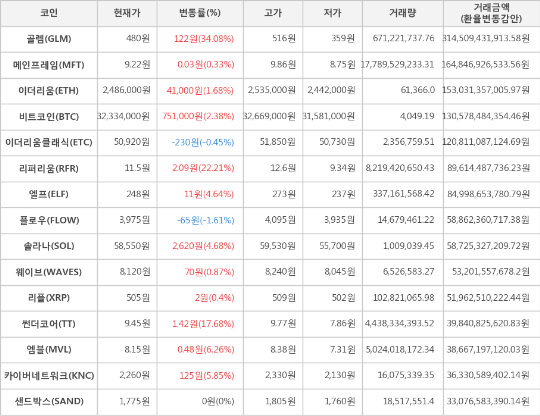 가상화폐 비트코인 2.38% 상승, 골렘 34.08% 상승